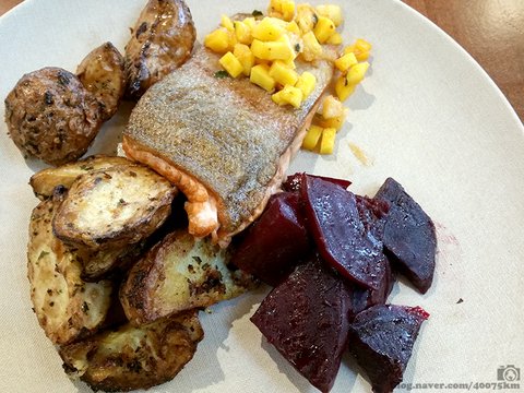 카페테리아에서 먹은 송어 요리. 구운 생선의 핵심은 "껍질은 바삭바삭 속살은 촉촉하게" 만드는 거지요.
