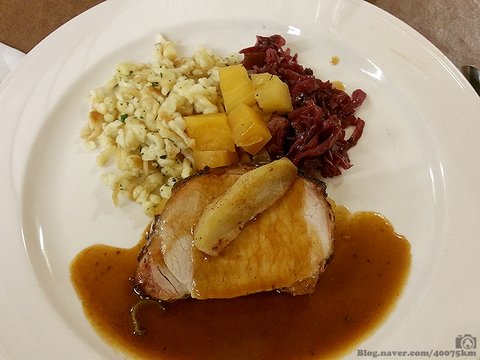 돼지고기 로스트, 호박, 붉은 양배추 절임.