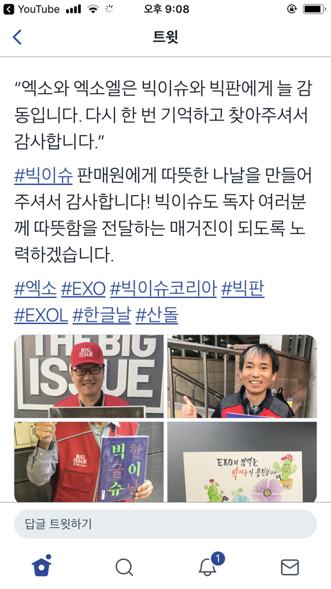 이건 빅이슈 사면 안에 들어있는 빅이슈 판매원분의 손편지야 잡지 하나하나에 넣어주시더라 이제 날씨도 쌀쌀해지는데 꼭 잘 파셨으면 좋겠어 난 엑소가 직접 연락해서 한글날이라고 손으로 직접 글써준 엑소도 너무 고맙고 그에 부응해서 잡지 계속 사고 따뜻한 행동하고 자기들 영향력 제대로 사용하는 엑소하고 엑소엘 너무 멋지다ㅠㅠㅠㅠ
