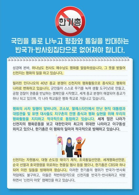 신천지는 자원봉사, 대형 손도장 태극기 제작, 조국통일선언문, 세계평화선언문, 순국선열과 호국영령을 위로하는 현충일 행사 등을 했으나, 한기총은 CBS와 하나 되어 자원봉사를 못 하게 하고, 대형 손도장 태극기를 현충원에 보관하지 못하게 했고, 조국통일선언문 비석을 뽑아 버리게 했고, 평화 행사를 하지 못하게 대관을 방해하여 왔습니다. 이러한 한기총의 행위가 반국가・반사회적임에도 불구하고, 이들은 적반하장격으로 신천지를 반국가・반사회라고 비방하면서 ‘신천지 아웃’ 캠페인을 하고 있습니다.