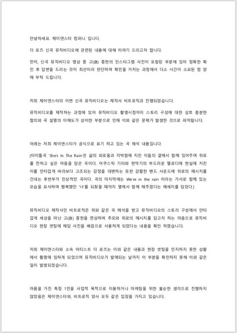 하지만 더로즈는 절대로 고(故) 김종현님의 추모를 의미로 만든 노래가 아니며, 이 사건의 핵심은 제작사 손동락 감독이라는 점을 꼭 알아주셨으면 감사하겠습니다. 또한 소속사 제이앤스타의 평소 일처리를 바라본 결과, 노이즈 마케팅을 할 정도로 능숙하지 않다는 점 역시 알아주셨으면 감사하겠습니다.