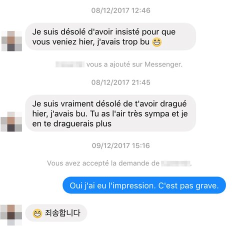 L: 어제 너네 오라고 우겨대서 미안. 너무 취했었음L: 어제 너 꼬시려고 해서 정말 미안. 취했었음. 니가 너무 괜찮아보여서 그럼. 앞으로 안그럴게.나: 그래보였음. 괜찮.