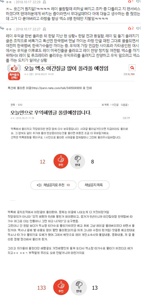 레이 우익글 올라오고 묻히면서 엑소 까글 우르르 올라왔을때랑 한달내내 똑같은 플로우ㅇㅇ 레이 우익 묻으면서 한국멤버 뿐 아니라 한국가수 까고 이간질 글로 도배함