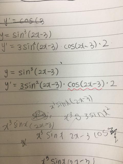 좀 더러운데 저기 빨간색 그어놓은 부분sin^3(2x-3) 을 미분했는데 cos이 왜 나와? 속미분 한 거라는데 이해가 안 돼ㅠ