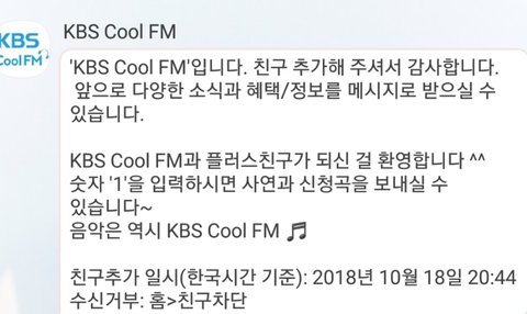+ 카카오톡에서 KBS Cool FM 친구추가하고 1 보내면 동시간대 방송중인 라디오에 곡신청가능!!