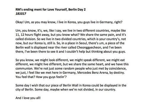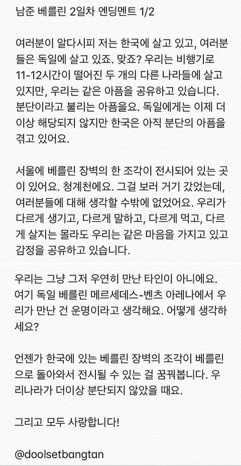 가수와 팬, 더 나아가 한국인과 독일인, 이 관계들 사이에서 두 정체성이 감정적으로 공유하고 연결되는 지점들을 잘 건드린 멘트네. 콘서트에서 팬들 상대로 한국의 분단과 통일에대해 얘기하는 아이돌은 진짜 처음 봐. 방탄의 리더가 남준이라 너무 자랑스러워❤