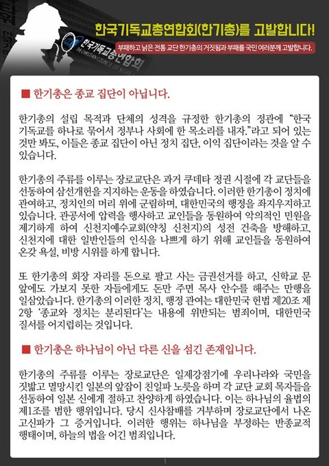 부패하고 낡은 전통 교단 한기총의 거짓됨과 부패를 국민 여러분께 고발합니다.