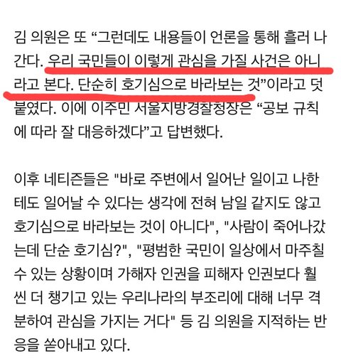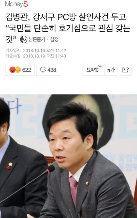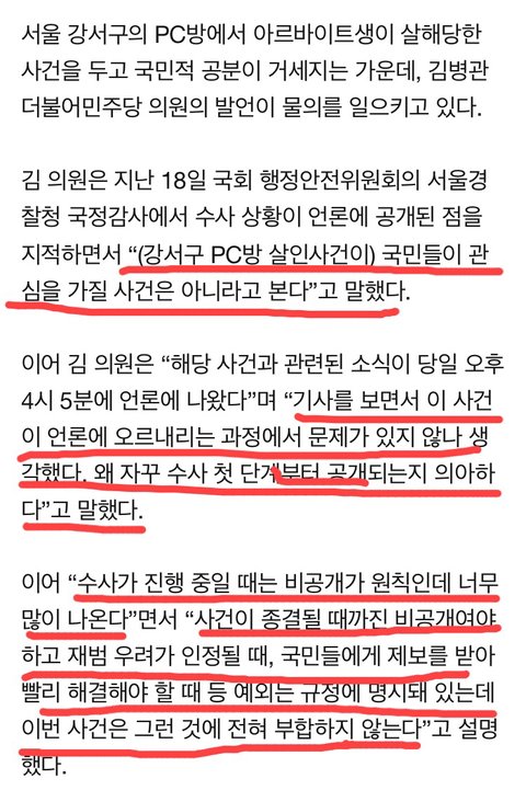기사 보다가 너무 어이없고 진짜 화가 나서 올린다 저런 사람이 무슨 의원 한답시고 저러고 앉아있는 건지 진짜 나랏꼴 잘 돌아간다 강서구 pc방 살인 사건 피해자는 누구한텐 소중한 가족이자 애인일테고 또 친구일텐데 그런 소중한 이가 무고한 희생을 당했고 또 수사가 부실하게 이루어졌는데 그 유가족 분들이 백날 천날 재수사를 요구 해도 무시할 거면서 이제와선 국민들이 관심 가질만한 일이 아니라고? 그럼 어떤 문제에 관심을 가져야 하나ㅋㅋㅋㅋ 진짜 웃겨서 말도 안 나온다 한창 꽃 펴야 할 청년이 세상 빛도 못 보고 하늘로 갔는데 그 원인이 경찰들의 미흡한 대처였으니 그래놓고선 동생은 혐의가 없다고 풀어준다 그게 말이 되냐고...