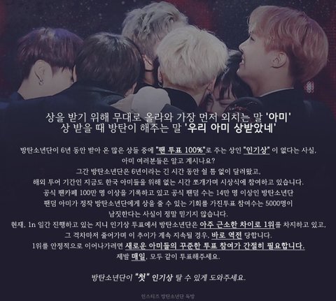 제발 투표 좀 하자 6년차 이고 첫 인기상 줘야지... 제발 100% 투표로 결정 된 상 투표 하자 떡밥을 많이 주는 타니들 위해서라도 받는게 있으면 주는것도 있어야지..ㅠㅠ 해외투어 에서 부상투혼 하고 있는데.. 제발 나 하나 쯤 안해도 되겠지 보단 나도 도와줄래 나도 할래 이런맘 으로 해줘 ㅠㅠ 5000명... 너무 하지 않니? 공식이 15만명 되면서.. 공카는 100만명 넘고 ㅠㅠ 부탁할게 ㅠㅠ