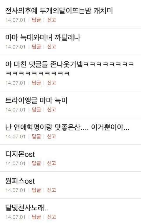 아 난 오히려 만화주제가 같은건 잘들을수있는데 투애니원 내가 제일 잘나가 나 소녀시대 OH같이 십년전쯤 핫했던 곡 듣는게 너무 쪽팔려 ㅠㅠㅠㅠㅜㅜㅜㅜㅜㅋㅋㅋㅋㅋㅋㅋㅋㅋㅋ
