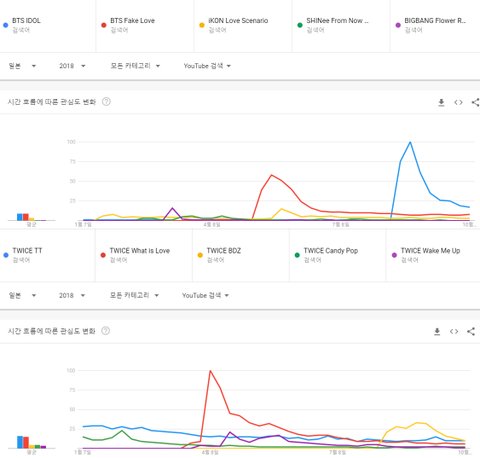 남자가수 : 1위 방탄소년단 아이돌, 2위 방탄소년단 페이크러브, 3위 아이콘 사랑을 했다, 4위 샤이니 프롬 나우 온, 5위 빅뱅 꽃길