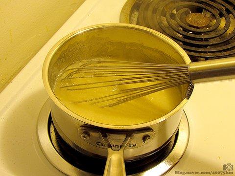 버터를 중탕으로 가열해서 유지방 부분만 따로 건져낸 정제 버터를 사용해야 하지요. 하지만 지금은 만들어 놓은 게 없으므로 일반 식용유를 사용합니다. 언제 한 번 날 잡아서 정제 버터 한 통 만들어야 하는데...