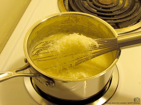 1~20분 정도 약불에 끓여가며 콘밀이 다 익으면 불을 끄고 버터 조각과 갈아낸 치즈를 섞어줍니다.