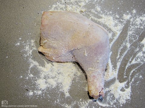 닭다리 한 쪽을 소금과 후추로 간하고 껍질 있는 쪽만 밀가루를 뿌려 바른 다음 탁탁 털어서 여분의 밀가루를 털어내면 준비 완료.