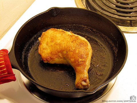 무쇠팬에 오일을 넉넉하게 두르고, 풍미를 더하기 위해 버터를 약간 첨가한 후 닭다리의 껍질 부분이 아래로 가게 해서 굽습니다.
