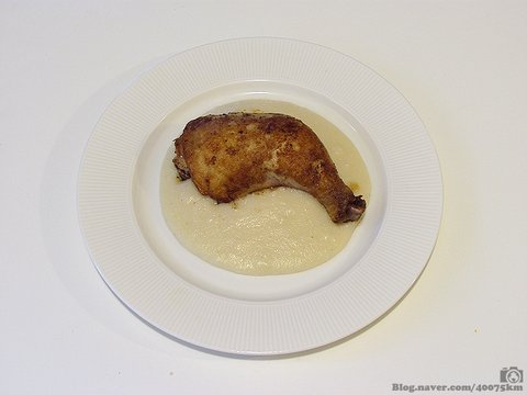 완성된 치킨 폴렌타. 블로그에는 사진을 따로 올렸는데, 실제로 요리할 때는 폴렌타 슬슬 저으면서 닭다리를 요리하면 두 요리가 얼추 비슷하게 완성됩니다.