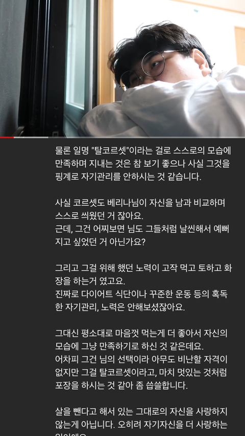 탈코든 뭐든 자기 하고싶은 대로 살게 내비 둬ㅋㅋ 니들 보고 왜 한혜진만큼 안말랐어 자기관리 못하잖아 살빼! 하면 이건 정상이냐? 애초에 살 찐것도 본인이 잘못한것도 아니더만 자기가 이제 운동도 즐기면서 한대고 신경 안쓴다는데 참 오지랖들...