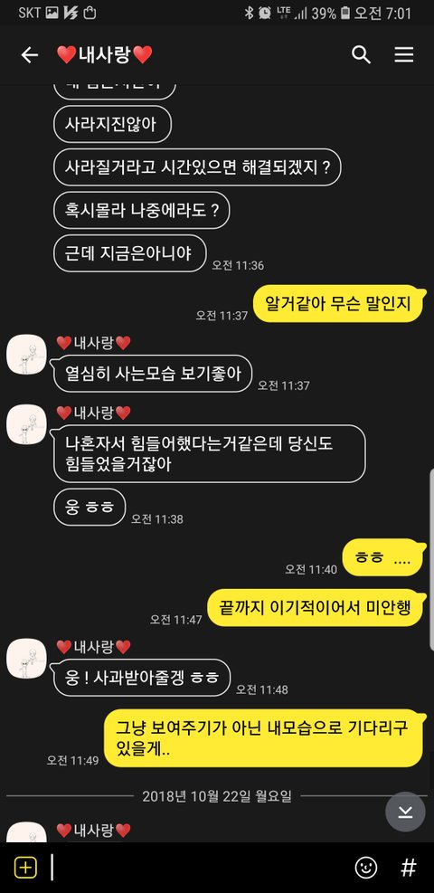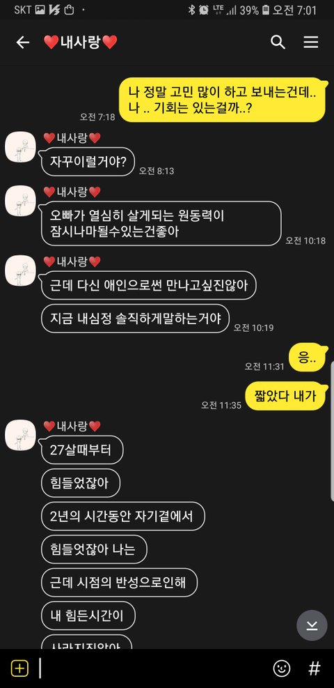 첫번째 사진이 현재 프사인데 여자가 전 여자친구를 많이 닮앗어요 처음보는 사진인데 남자는..잘 모르겟네요..심경변화가 궁금해서 올린거구 나머지는 헤어진후에 톡내용들이에요..