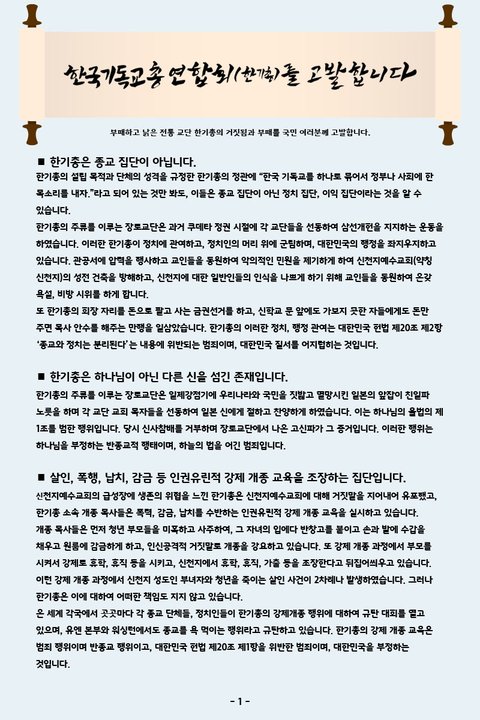 부패하고 낡은 전통 교단 한기총의 거짓됨과 부패를 국민 여러분께 고발합니다.