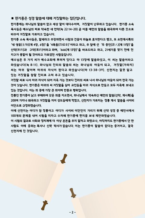 ■ 한기총은 성경 말씀에 대해 거짓말하는 집단입니다. 한기총에는 하나님의 말씀이 없고 세상 말이 대다수이며, 거짓말이 난무하고 있습니다. 한기총 소속 목사들은 예수님의 피로 약속한 새 언약(눅 22:14-20) 곧 이룰 예언의 말씀을 왜곡하여 다른 뜻으로 바꾸어 거짓말로 가르치고 있습니다. 한기총 소속 목사들은, 말세라고 주장하면서 사람과 건물이 하늘로 휴거한다고 했고, 또 요한계시록의 ‘네 생물(生物)(계 4장, 6장)’을 ‘4복음(四福音)’이라고 하고, 주 앞에 선 ‘두 증인(證人)(계 11장)’을 신약(新約)과 구약(舊約)이라고 하며, ‘666(계 13장)’을 바코드라고 하고, 21세기를 맞기 전에 전 지구가 종말이 될 것이라고 가르쳤던 사람들입니다.예수님은 두 가지 씨가 예수교회에 뿌려져 있다고 마 13장에 말씀하셨고, 이 씨는 말씀이라고 하셨습니다(눅 8:11). 하나님의 진리의 말씀의 씨는 하나님의 아들이 되고, 거짓말(가라지) 씨는 마귀 말이며 마귀의 자식이 된다고 하셨습니다(마 13:38-39). 신천지는 잘못 알고 있는 거짓말을 참말 진리로 고쳐 주고 있습니다. 거짓말 씨로 나서 마귀 자식이 되어 지옥 가는 것보다 진리의 씨로 나서 하나님의 아들이 되어 천국 가는 것이 낫습니다. 한기총은 마귀의 씨 거짓말을 심어 교인들을 마귀 자식으로 만들고 모두 지옥에 보내고 있는 것입니다. 이는 죄 중에 가장 큰 죄이며 반종교 행위입니다. 전통인 한기총이 낡고 부패하여 갖은 죄를 지으면서, 하나님께서 약속하신 예언의 말씀(신약, 계시록)을 200여 가지나 왜곡하고 거짓말을 지어 성도들에게 먹였고, 신천지가 가르치는 정통 계시 말씀을 사이비 이단으로 규정하였습니다.이에 신천지는 어디가 참 정통이고 어디가 사이비 이단인지 가리기 위해 신약 성경 중 예언서에서 100개의 문제를 내어 시험을 치자고 수차례 한기총에 편지를 보내 제안하였습니다. 이 시험의 결과로 사회와 정치계에 더 이상 혼돈을 주지 말자고 하였으나, 아직까지도 한기총에서 단 한 사람도 이에 응하는 목사나 신학 박사가 없습니다. 이는 한기총이 말씀이 없다는 증거이고, 결국 신천지에 진 것입니다.■ 한기총은 국민을 둘로 나누고 평화와 통일을 반대하는 반국가·반사회집단으로, 없어져야 합니다.