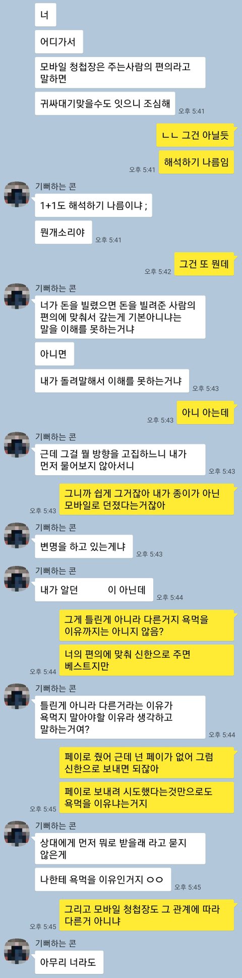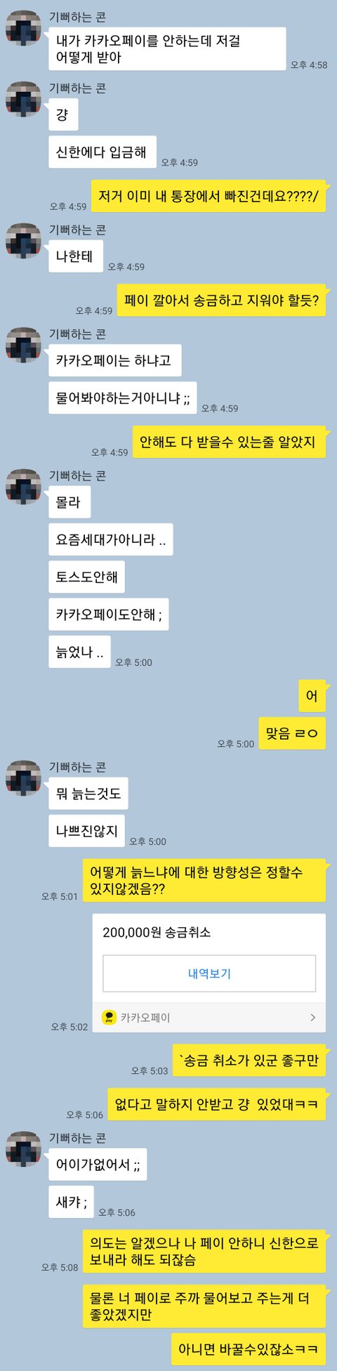 그 후 다음날 카카오페이를 통해서 송금을 한 뒤에 대화한 내용을 첨부하였습니다.