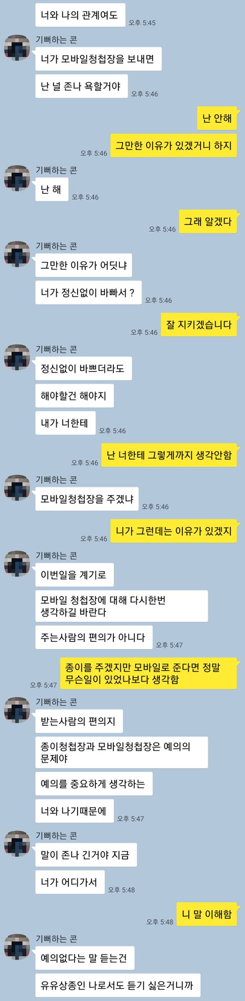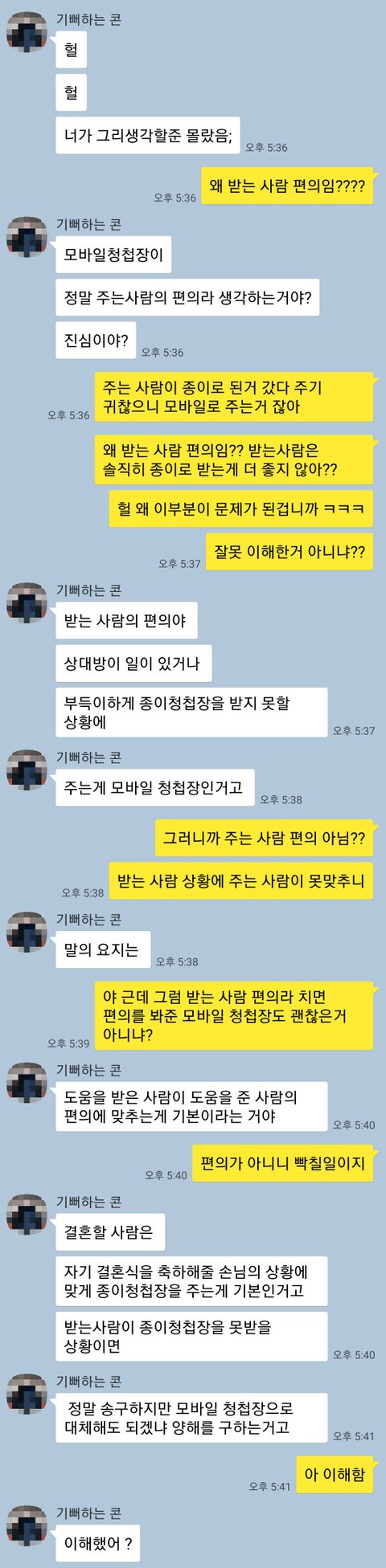 이 대화 중 편의에 관한 내용으로 모바일 청첩장을 예시로 들었으나