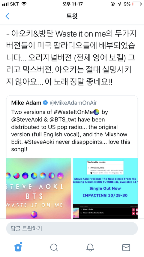 오리지널 버전하고 믹스버전 2가지가 미국 팝라디오에 배포됐대!!!!