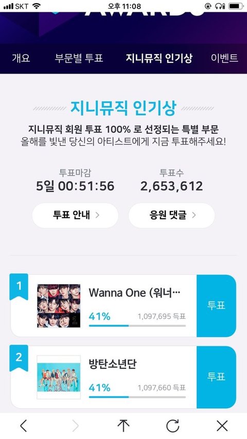 오늘지켜보니까상대쪽이 더빠르게 표가모인다 나도내부턴 자정전에해야겟다 낮에 1위백날하고있어봤자네. 근질거리지만 참앗다가 밤에해야겟다.