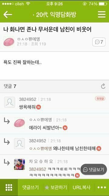 +) 아이돌 관련 짤들은 삭제했어 ㅠㅠ 난 그 짤 아이돌의 팬도 아니고 난 봤을 때 웃겼어서 넣었던 거였는데 베플까지 될 줄은 꿈에도 몰랐고.. ㅠㅠ 봤을 때 불편했으면 정말 미안해 ㅠㅠ 그 아이돌 팬들한테도 괜히 욕먹이게 한 것 같아서 미안하다..