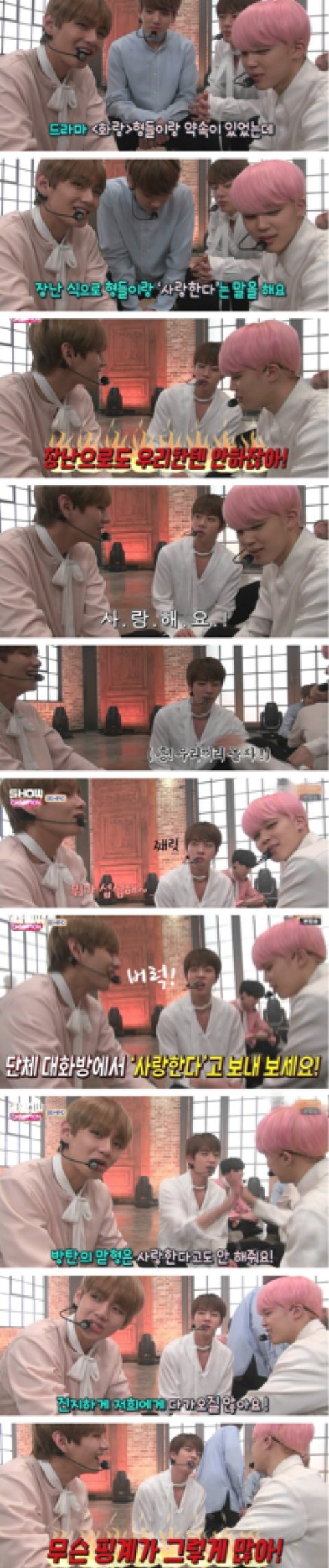 뷔 : 사랑한다고 멤버들한테 하는건 어색해요.