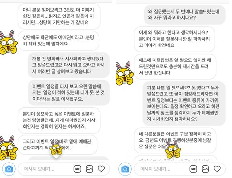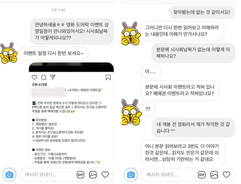 오늘 1시반 경 저는 인스타그램을 하다가 영화 예매권 이벤트를 발견하였고, 해당 영화가 아직 개봉 전이어서 예매권 이벤트를 시사회 이벤트라고 생각한 상태에서 글을 읽었고, 상영일정이 기재되어 있지 않아서 주최자분께 디엠을 통해 상영일정을 질문했습니다. 이후 이벤트 일정을 다시 확인하고 오라는 응답을 받았고 저는 일정이 적혀 있는데 내가 못 봤나 싶어서 다시 확인해봤음에도 일정이 적혀 있지 않아서 다시 디엠을 보냈고 두 차례의 재질문 이후에야 제가 예매권 이벤트를 시사회 이벤트로 착각했다는 것을 들었습니다.