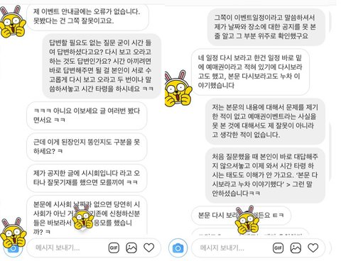 덧붙이자면, 착각한 부분에 대해서는 저 역시 제 실책임을 분명히 인지하고 있고, 실제로 답변을 듣자마자 '제가 착각한 것 같다'고 말씀드렸습니다. 여기서 대화가 끝난 줄 알았는데 의도를 알 수 없는 비난이 담긴 메시지가 와서 대화를 이어나간 것입니다.