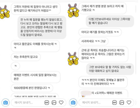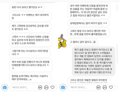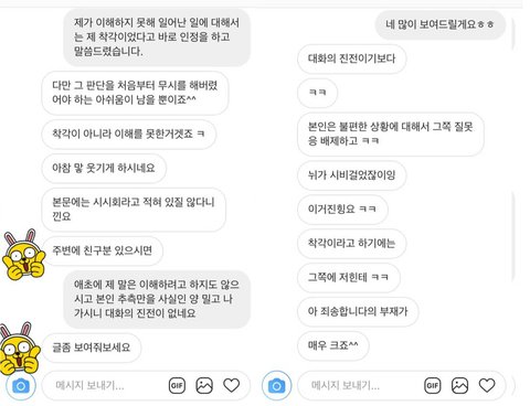 '제 말이 이해가 안되나요?'등의 공격적인 언사에 무척 불쾌했지만 침착하게 제가 착각한 것 같다고 웃으면서 말씀드렸는데 이후 계속해서 디엠을 통해 제가 본인을 기만했다고 말씀하시며 비꼬시고 친구들에게 보여주라고 말씀하시길래 객관적으로 판단해주시기를 바라는 마음에서 사실 그대로 토씨하나 안빠트리고 캡쳐해서 글을 씁니다.