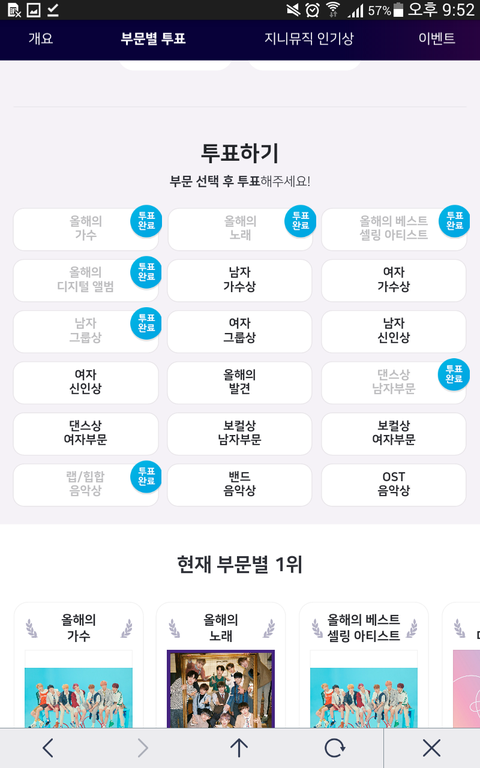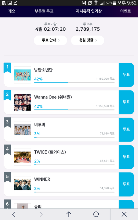 자정 가까워지면 더 밀릴 거야 무료투푠데 제발 앱 깔아서라도 해줘 난 페메 지워가면서 지니 깔아서 투표 하고 있고 친구들한테 맛있는 거 사줘가면서 부탁하고 가족들 폰으로도 다 돌리는데..ㅠㅠ