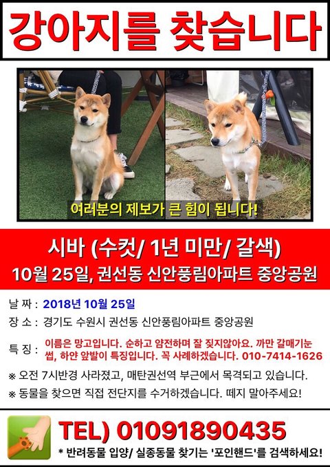 10월25일 아침 7시반경 목줄이 풀려 사라졌습니다.