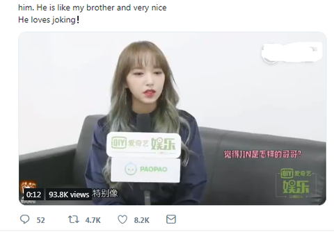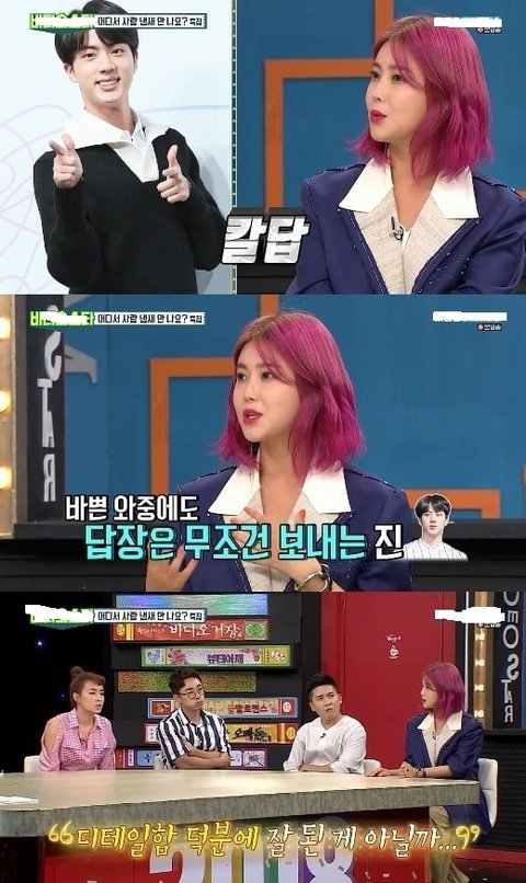 진은 소란스러운 스튜디오에 "뭔진 모르겠지만 사랑해요"라고 말했다. 출연진들이 팬이라며 한마디씩 하자 "어... 뭔진 모르겠지만 너무 재밌어 보여요"라고 말해 웃음을 전했다.