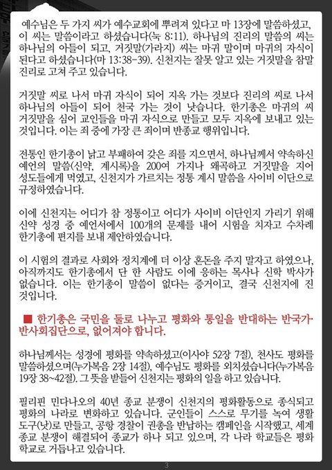 ■ 한기총은 성경 말씀에 대해 거짓말하는 집단입니다. 한기총에는 하나님의 말씀이 없고 세상 말이 대다수이며, 거짓말이 난무하고 있습니다. 한기총 소속 목사들은 예수님의 피로 약속한 새 언약(눅 22:14-20) 곧 이룰 예언의 말씀을 왜곡하여 다른 뜻으로 바꾸어 거짓말로 가르치고 있습니다. 한기총 소속 목사들은, 말세라고 주장하면서 사람과 건물이 하늘로 휴거한다고 했고, 또 요한계시록의 ‘네 생물(生物)(계 4장, 6장)’을 ‘4복음(四福音)’이라고 하고, 주 앞에 선 ‘두 증인(證人)(계 11장)’을 신약(新約)과 구약(舊約)이라고 하며, ‘666(계 13장)’을 바코드라고 하고, 21세기를 맞기 전에 전 지구가 종말이 될 것이라고 가르쳤던 사람들입니다.예수님은 두 가지 씨가 예수교회에 뿌려져 있다고 마 13장에 말씀하셨고, 이 씨는 말씀이라고 하셨습니다(눅 8:11). 하나님의 진리의 말씀의 씨는 하나님의 아들이 되고, 거짓말(가라지) 씨는 마귀 말이며 마귀의 자식이 된다고 하셨습니다(마 13:38-39). 신천지는 잘못 알고 있는 거짓말을 참말 진리로 고쳐 주고 있습니다. 거짓말 씨로 나서 마귀 자식이 되어 지옥 가는 것보다 진리의 씨로 나서 하나님의 아들이 되어 천국 가는 것이 낫습니다. 한기총은 마귀의 씨 거짓말을 심어 교인들을 마귀 자식으로 만들고 모두 지옥에 보내고 있는 것입니다. 이는 죄 중에 가장 큰 죄이며 반종교 행위입니다. 전통인 한기총이 낡고 부패하여 갖은 죄를 지으면서, 하나님께서 약속하신 예언의 말씀(신약, 계시록)을 200여 가지나 왜곡하고 거짓말을 지어 성도들에게 먹였고, 신천지가 가르치는 정통 계시 말씀을 사이비 이단으로 규정하였습니다.이에 신천지는 어디가 참 정통이고 어디가 사이비 이단인지 가리기 위해 신약 성경 중 예언서에서 100개의 문제를 내어 시험을 치자고 수차례 한기총에 편지를 보내 제안하였습니다. 이 시험의 결과로 사회와 정치계에 더 이상 혼돈을 주지 말자고 하였으나, 아직까지도 한기총에서 단 한 사람도 이에 응하는 목사나 신학 박사가 없습니다. 이는 한기총이 말씀이 없다는 증거이고, 결국 신천지에 진 것입니다.■ 한기총은 국민을 둘로 나누고 평화와 통일을 반대하는 반국가·반사회집단으로, 없어져야 합니다.