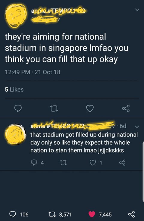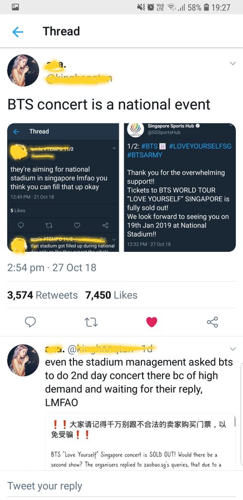티켓팅 전에 싱가폴 공연 매진 못시킨다는 말에다가 네셔널 스타디움은 싱가폴 국가 행사 아니면 매진 안된다는둥 짹에 뭐라한 애가 있거든(사실 mu라즈나 지금도 티케팅이 매진 인된공연이 많아) ㅋㅋㅋ 근데 공연 매진되구 그 짹 폭파.... 싱가폴 아미들 지금 싱가폴 국가 이벤트를 즐기자구 난리남 벌써 2019년이 기다려지네 ^^ 그중에 저말에 열받아서 말레시아 아미는 그아이랑 한판 짹에서 붙었는데 팩트로 날려버림(프사는 민지 얼굴로 ㅋㅋㅋ 조곤조곤 팩트 시전) ㅋㅋㅋ 여러모로 직전에 ㅇㄱㄹ 설치더니 대박 터지구 이제는 2일즈 공연 요청하는 사태도 나구.. 즐겁당