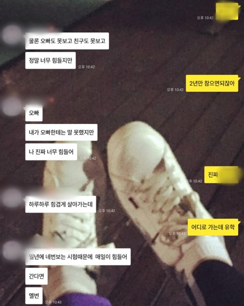 그녀가 학업으로 스트레스를 받고 힘들다는 건 알았지만, 한국을 떠나서 유학을 고민할 정도로 힘든 줄은 몰랐습니다. 이때 저 자신에게 화가 나고 그리고 한편으로는 너무 슬펐습니다.