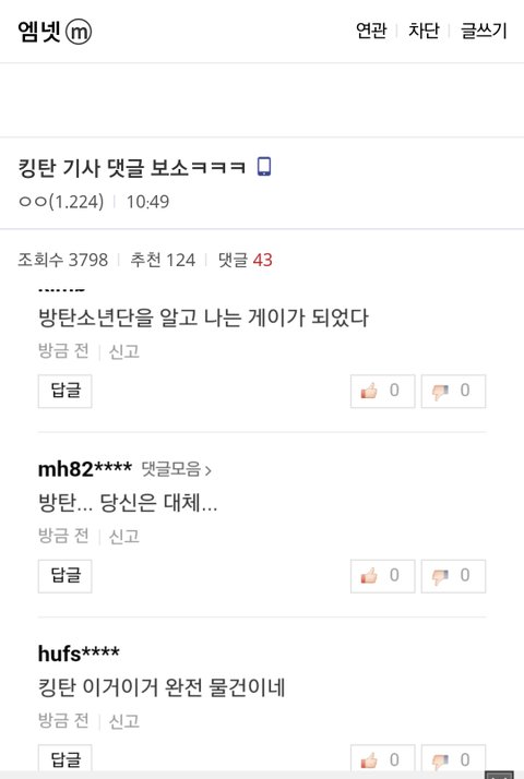 이 사진은 엠넷 갤에서 좌표 찍고 방탄 기사 포함 여러 기사를 댓관하며 우익 기사를 내리려고 달은 댓글들 직접 캡처해서 올린 거