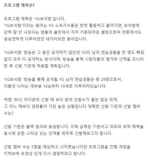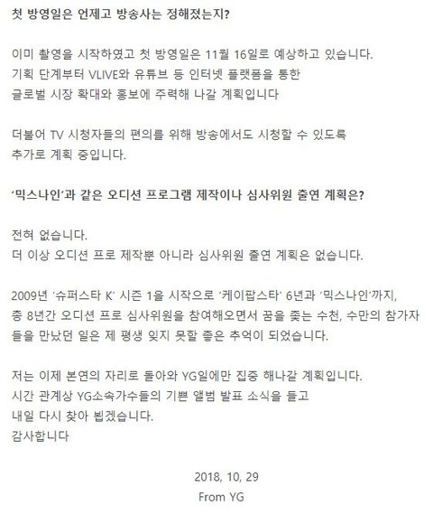 11월 방송되는 YG 보이그룹 데뷔 리얼리티