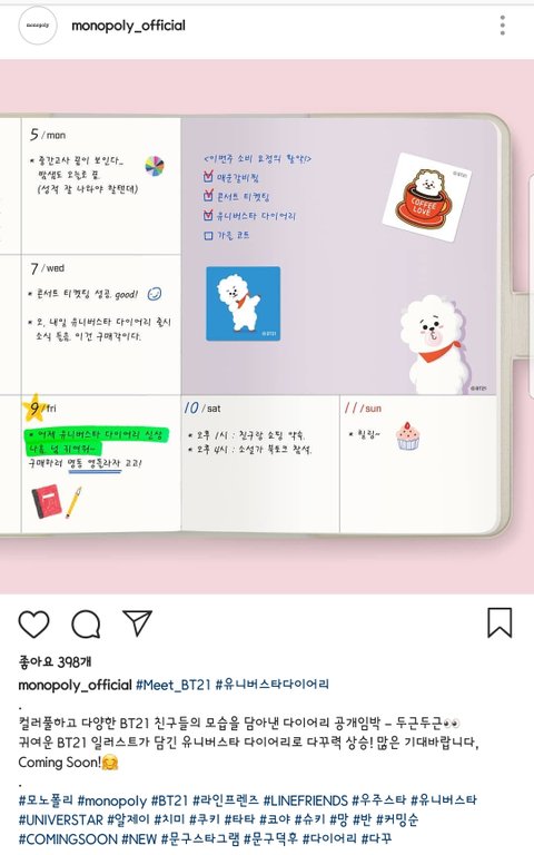 다이어리 쓸 것도 없는데 BT21 빵에 있는 띠부씰 붙여야겠다