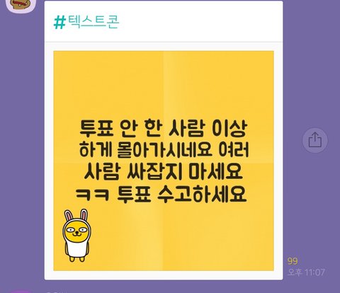 우리도 안친한데 연락 돌리는거 부끄럽고 유료결제해주는거 번거로워 그래도 참고 손떨면서 지켜보는데 투표홍보가 사담이라고 강퇴시키고 내알빠냐는 식으로 말하는 사람들 진짜 .. 무슨 생각으로 그래?