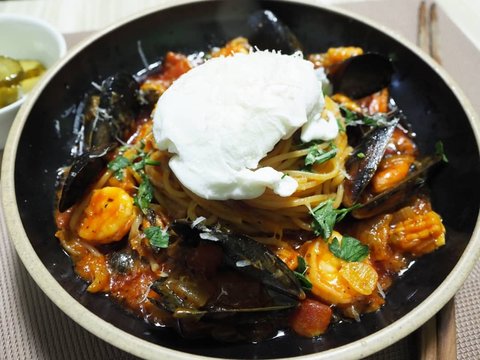 토마토 소스가 조금 남아있어서 만들었던 토마토 해산물 파스타. 위에 있는건 라코타 치즈가 아닙니다;;; 수란을 올리려했는데 오랜만에 해서 실패해서 치즈처럼 보이는 거에요 ㅠㅠㅠ