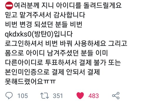 진이 계정기부했던 아이디 비번 qkdxks0(방탄0)이야!