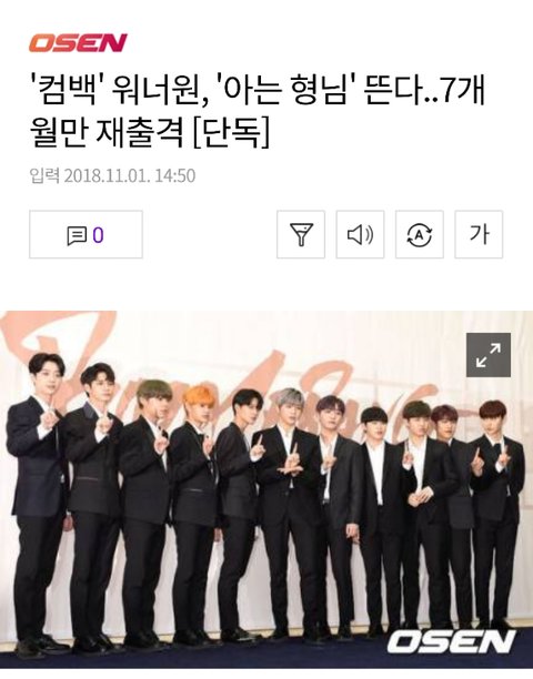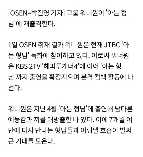 기사) '컴백' 워너원, '아는 형님' 뜬다..7개월만 재출격