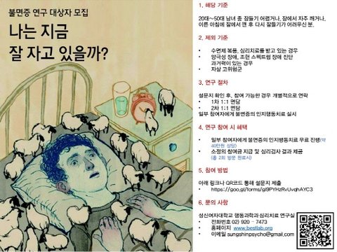 저희 연구실에서는 불면증 평가 프로그램의 개발을 위해 현재 불면증으로 잠들기 어려운 분들을 모집하고 있습니다.
