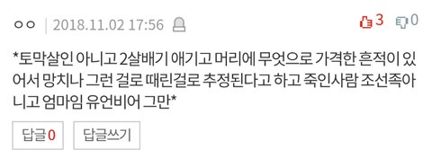 우리동네에 있는 초등학교 앞에 분식집이 있는데 그 분식집 앞에서 토막 살인사건 났대;; 나도 친구한테 들은거라 잘은 모르는데 그 친구는 현장에 갔었음 중국인이 어린애 죽였다는데 너무 무서워 죽겠다;; 친구가 사진 보내줬는데 경찰차랑 구급차 와있고 사람들 되게 많아 살인사건 같은거 내 주위에서 난적 처음이라 너무 무섭고 소름끼쳐 너희들도 조심해..