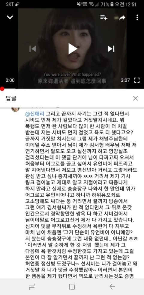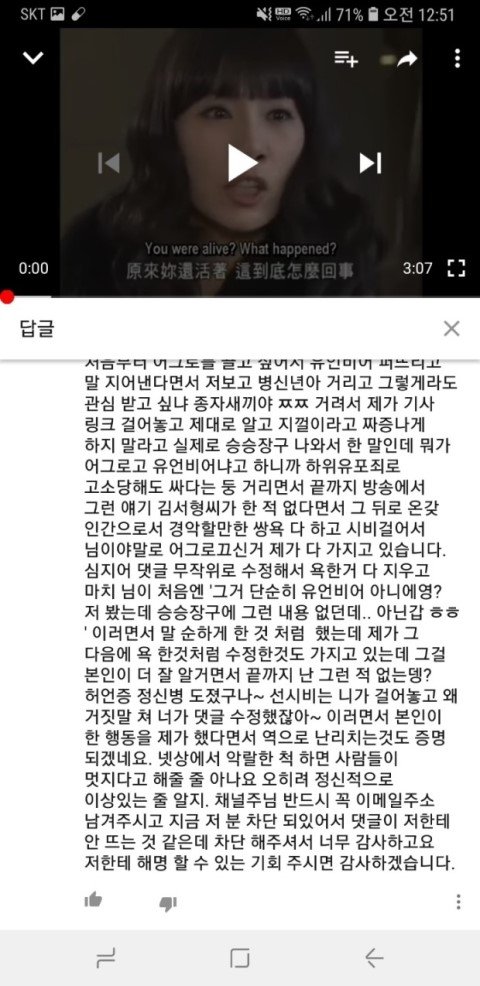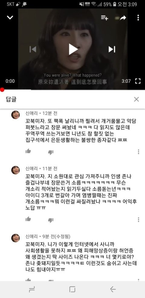 이게 마지막 댓글입니다. 음... 일단, 정말 긴 말 필요없이 뭐하고 사는 사람인지 직접 얼굴 한 번 보고 싶고요, 과연 제 얼굴 제 외모 제가 사는걸 보고도 저런 비하발언과 인신공격이 가능할지 너무 궁금합니다. 근데, 저도 열받아서 같이 욕 하고 한 부분이 한마디라도 있으니까 그게 좀 걸리기는 한데 저도 처벌 받아도 상관 없습니다. 저도 욕 한 부분 있으면 법적으로 처벌 받아도 정말 상관 없으니까 저 사람 어떻게 고소 할 방법 없을까요? 솔직히 저 채널에서 저 분이 먼저 욕해놓고 그 욕들 다 지우고 제가 먼저 욕하고 시비건것처럼 조작한거잖아요. 어떻게 저런 미친놈때문에 이런 일이 일어날 수가 있나요... 지금까지 저 채널 무난하게 잘 시청하고 그래왔는데, 진짜 아무것도 잘못한게 없는데.... 시비 걸고 싶어서 난동부리는 관종 하나때문에 제가 이렇게까지 아무것도 못하고 그저 이러고 있어야되나요? 제가 지금 이 글을 올린걸 저한테 욕한 저 사람이 보면 희열 느끼면서 좋아하겠죠? 이런 일 난생 처음입니다. 진짜 이 정도로 정신 나간 똘기잇는 사람이 작정하고 넷상에서 난리치는건 처음입니다. 이거 가만히 못 있겠고요, 저도 법적으로 처벌 받는 한이 있더라도 저 사람 어떻게든 고소하고 싶습니다. 저도 처벌 받고 저 분도 처벌받고 동시에 처벌 받을 수 있는 방법 알려주세요. 저도 욕 한게 잇으니 저분만 처벌하는건 불가능할거니까요. 혹시 보시는 분이 계시다면 댓글로 조언이나 아시는 정보가 있다면 알려주시면 정말 감사드리겠습니다...