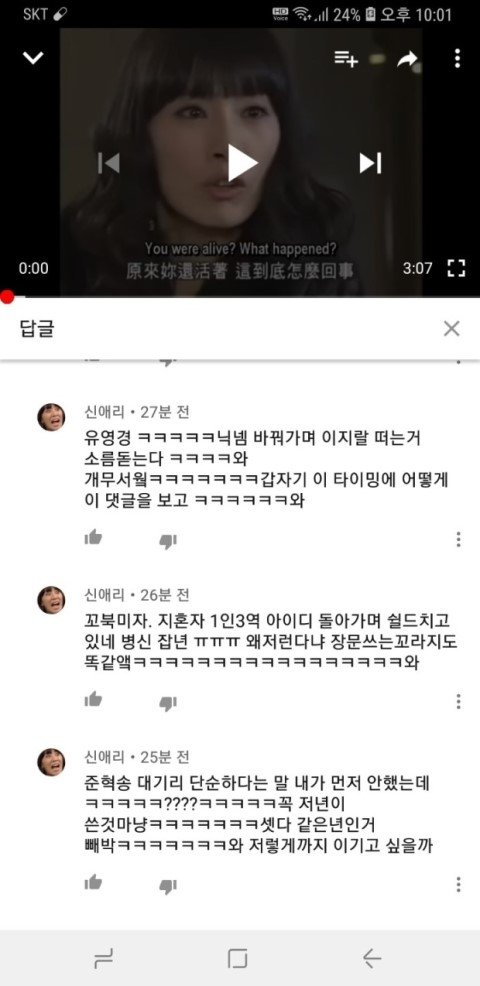 이렇게 한분은 같이 어이없다고 욕하시고 한분은 이성적으로 얘기했는데 이제는 저분들이 뜬금없이 제 부계정이라면서 제가 다른 아이디로 다른 사람인 척 연기한다면서 정신병자라는 둥 미친새끼 허언증새끼라는둥 온갖 욕설을 또 합니다. 자기한테 뭐라하는 사람있으면 다 제 부계정이라는데 진짜..ㅋㅋㅋ 너무 어이가 없어가지고, 보통은 다른사람이 와서 님 행동 잘못됐다고 그러거나 하면 거기서 가만있거나 아니면 그 사람들하고 뭐라하거나 그럴텐데 이 분은 느닷없이 자기한테 뭐라 하는 댓글은 전부 다 제 부계정이랍니다. 그래놓고 댓글 수정해서 미친듯이 혼자 발광하고 쇼하고 계속 저러는데 인터넷에 아무리 관종이 있다해도 저 정도로 정신 확 놓아버리고 작정하고 광견병 걸린 것 처럼 달려드는 사람 처음보네요. 저러는 이유가 뭐에요?? 와.. 오자마자 막 시비 걸면서 왜 저런 미친짓하는걸까요.